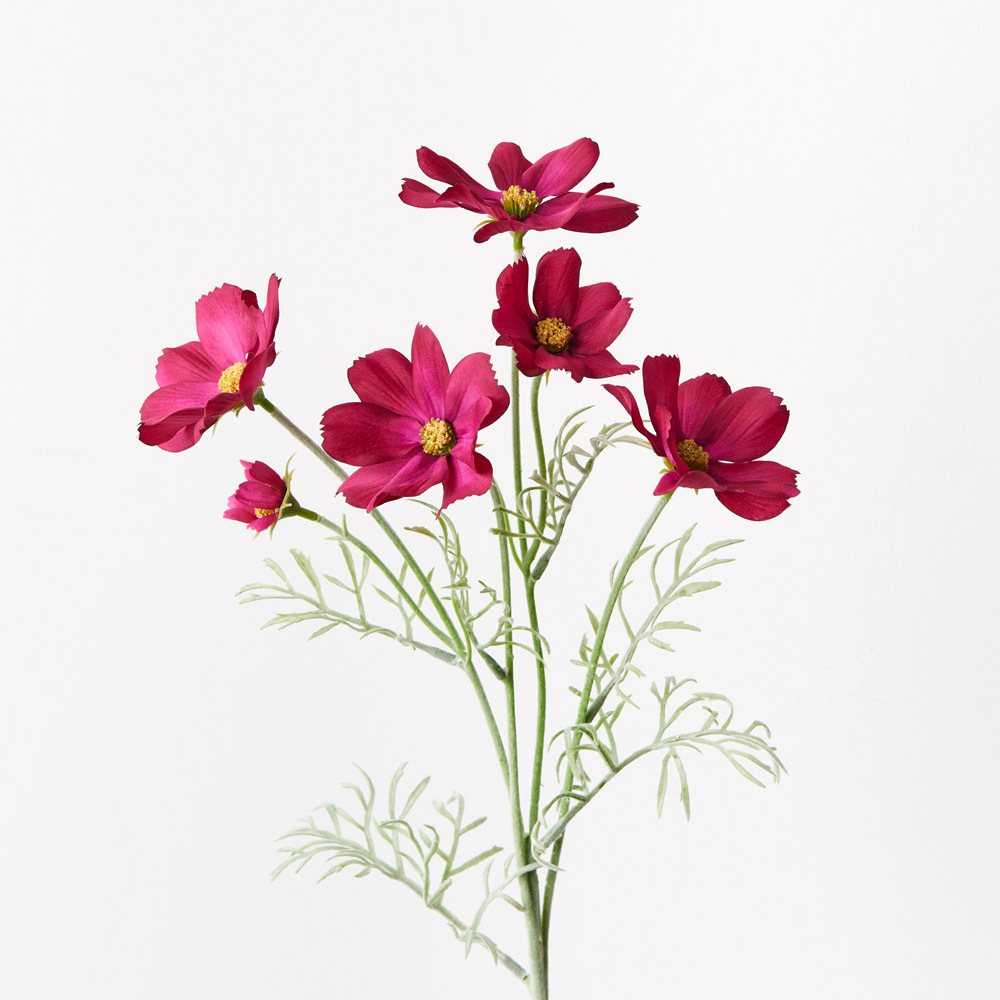 Cosmos Spray Burgundy 62cml Brighten up your interior space with this spring-blooming faux Cosmos in burgundy. Unbelievably realistic with their fresh touch you wouldn’t even think they’re faux! Style this artificial stem simply in a beautiful bunch on their own or create an arrangement from Floral Interiors huge variety of artificial flowers for impact. With minimal maintenance this faux stem can offer lasting beauty, keep out of direct sunlight.